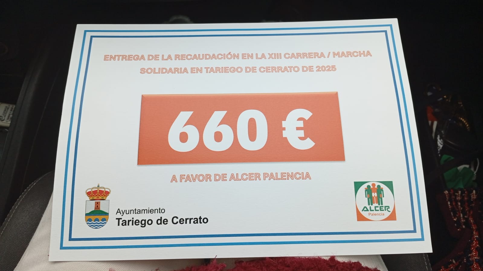 En el último día del año 2025, ALCER PALENCIA recibe de manos del AYUNTAMIENTO DE TARIEGO DE CERRATO y el CLUB ATLETISMO CUATRO CANTONES la recaudación de la carrera solidaria desarrollada durante la fresca mañana del 14 de diciembre. El total donado asciende a 660 €.