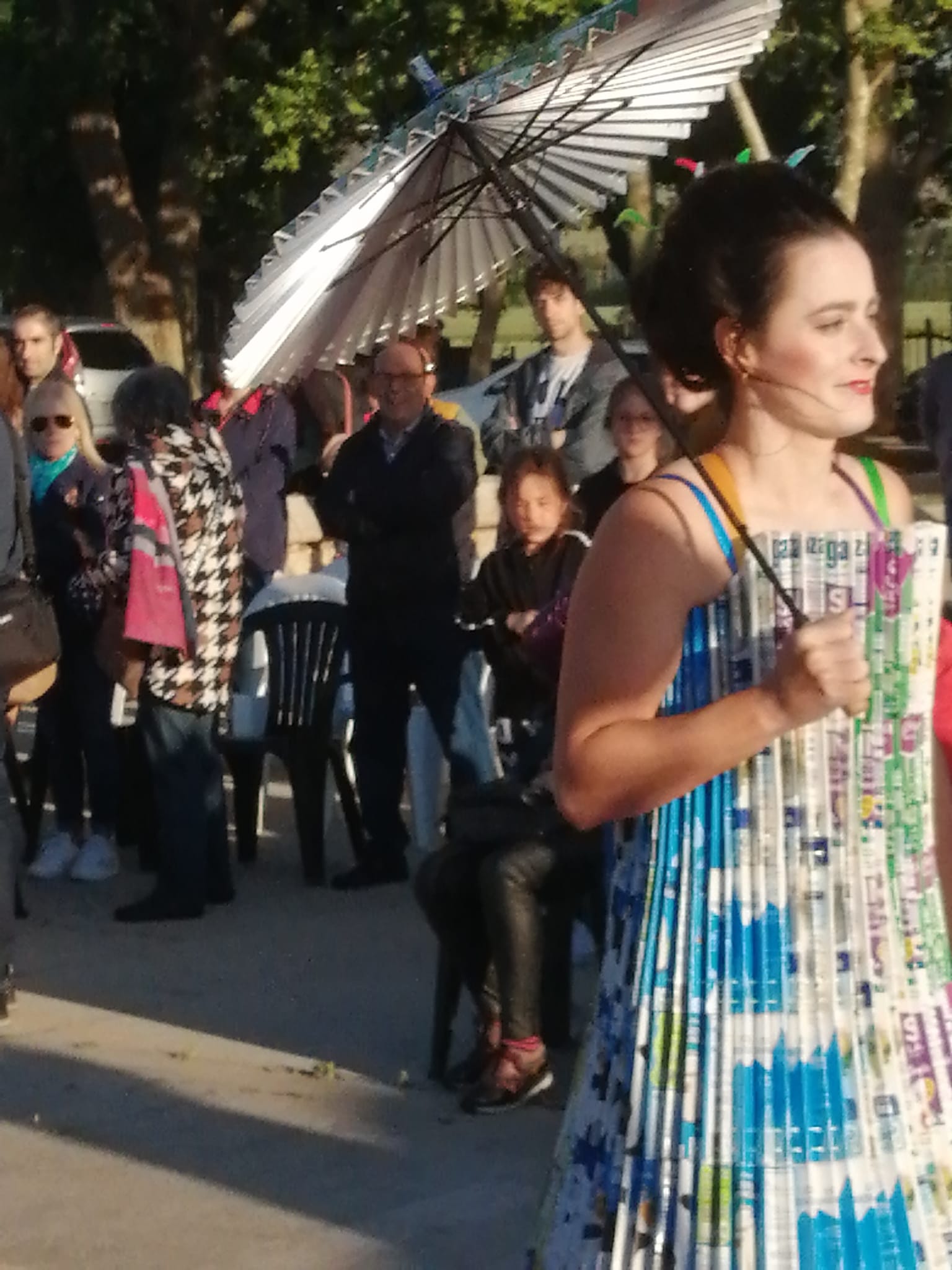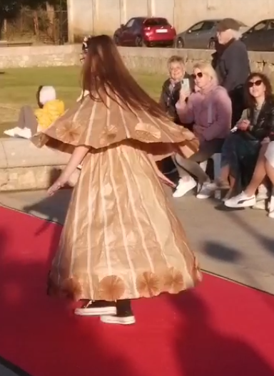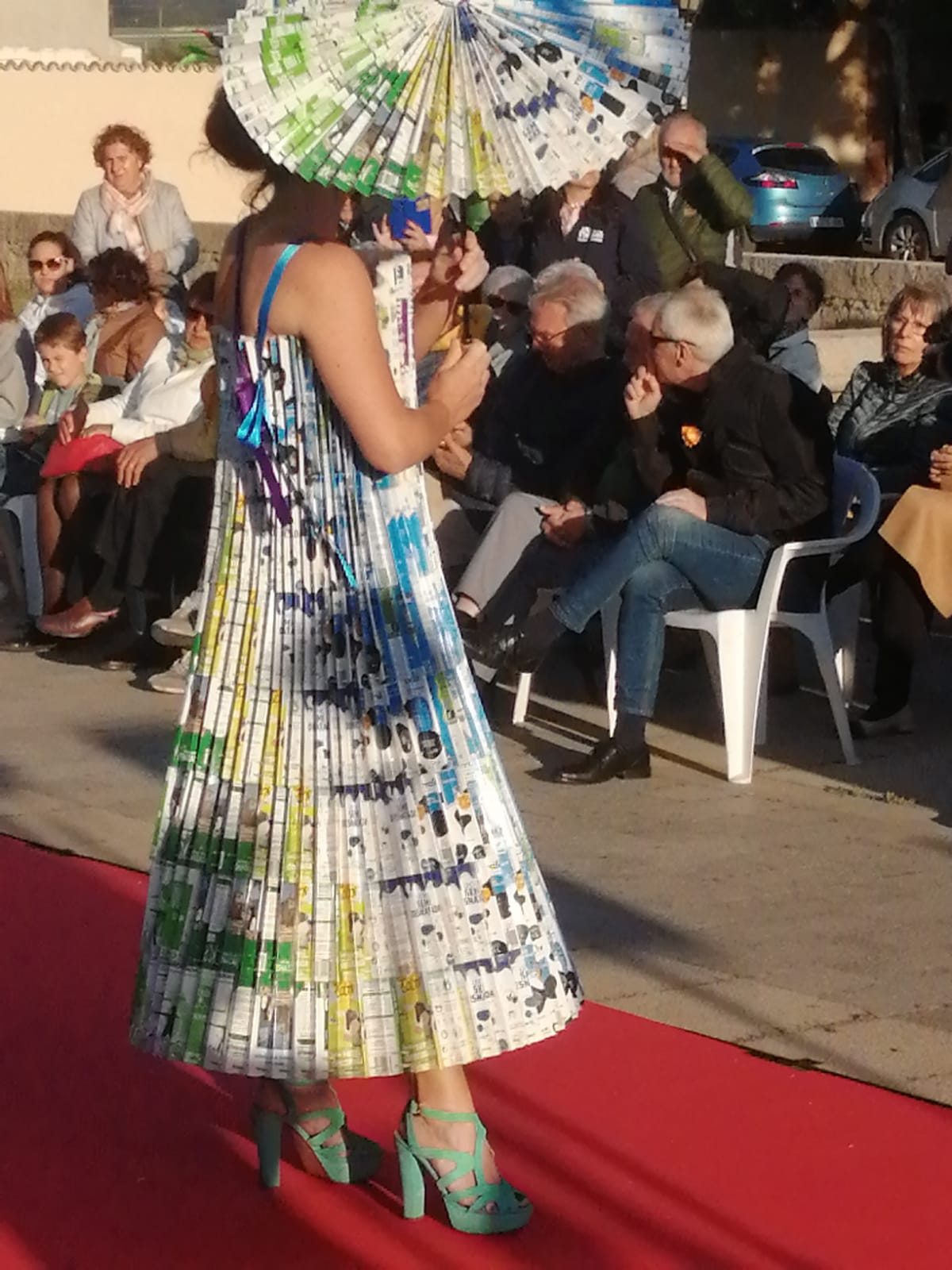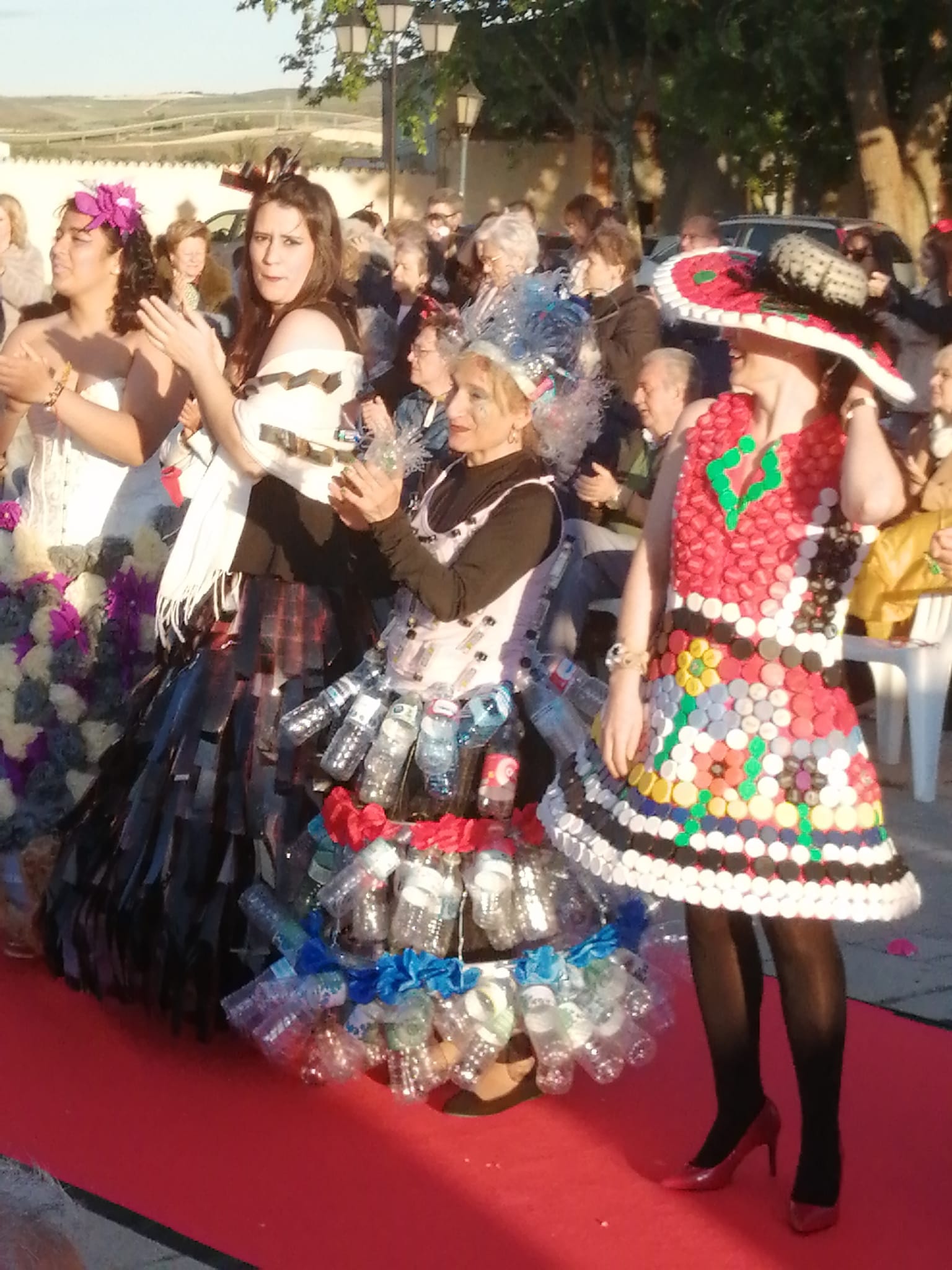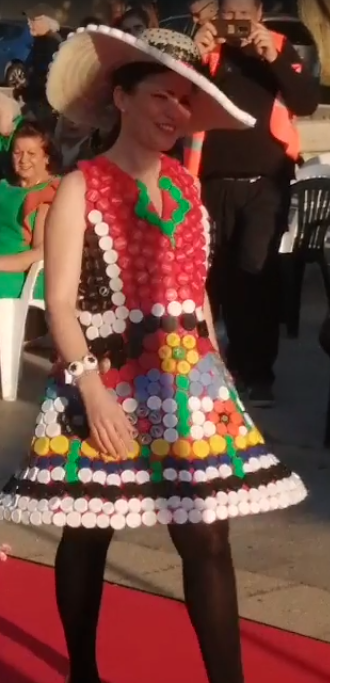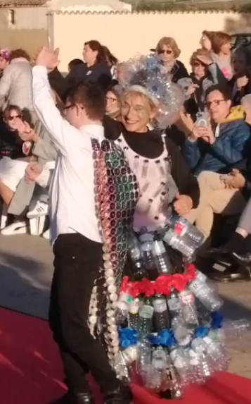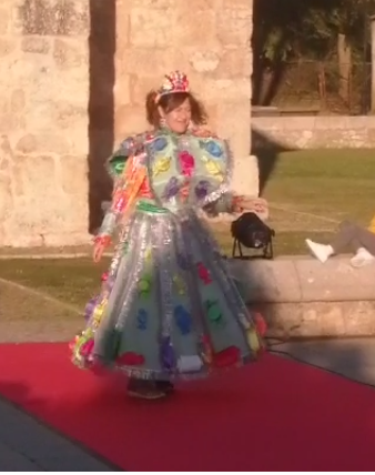 Encabezó la pasarela nuestra Sra Presidenta Inmaculada Gutiérrez. Vestía un traje elegante con los colores corporativos de ALCER, recordando a los presentes los fines solidarios de nuestra asociación, e invitando a la donación de órganos. A continuación el resto de modelos, con mucha gracia, elegancia y belleza arrancaron la admiración, las palmas e incluso sonrisas de todos los presentes. Desde cartones de leche con paraguas chino del mismo material, pasando a papel de envolver, corchos e incluso botellas de plástico fueron varios de los materiales de los vestidos.