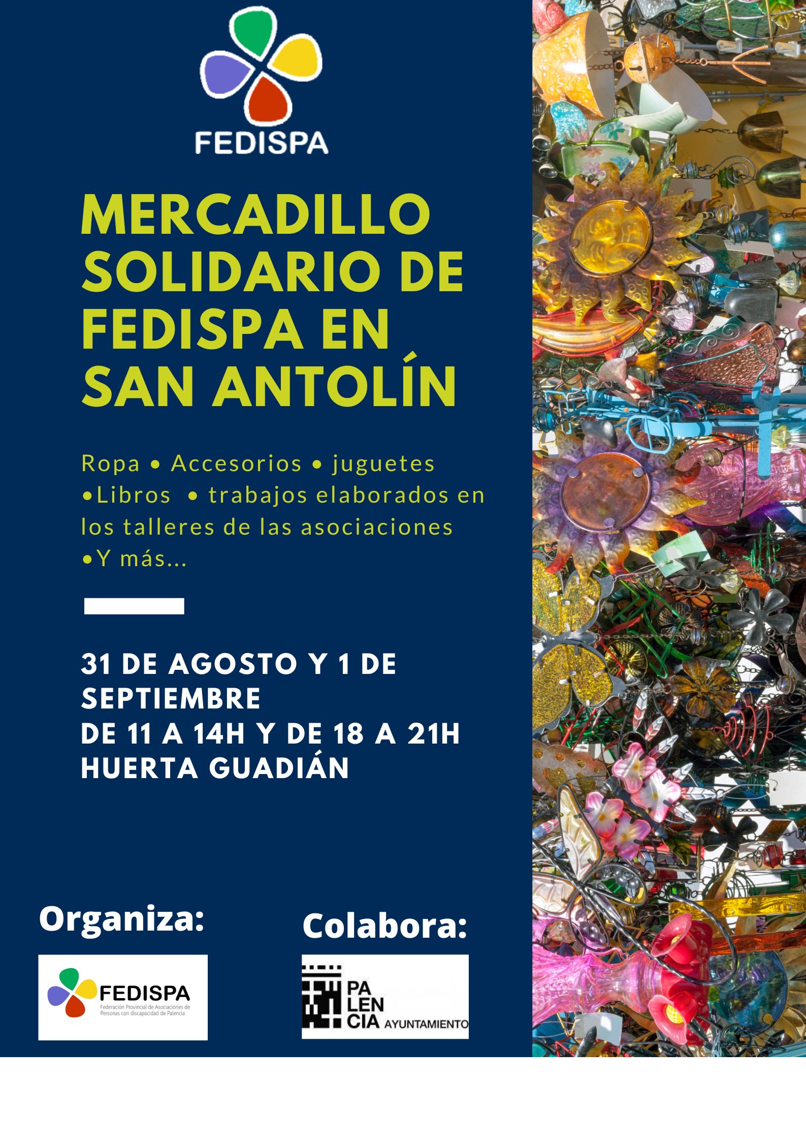 Este año, FEDISPA, en colaboración con el ayuntamiento de Palencia, organiza un MERCADILLO SOLIDARIO entre el 31 de Agosto y el 1 de Septiembre en el parque Huerta Guadián. La jornada será doble, de mañana y tarde, para el disfrute de palentinos y los visitantes de la ciudad en las fiestas.